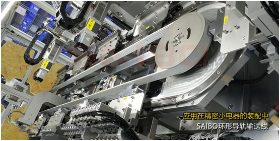 SAIBO環(huán)形導(dǎo)軌輸送線相當(dāng)于是一個集成平臺,把上下料、零部件組裝、壓接、打螺絲和檢測各工序全部集中到此平臺上,實現(xiàn)了省空間、高效率。