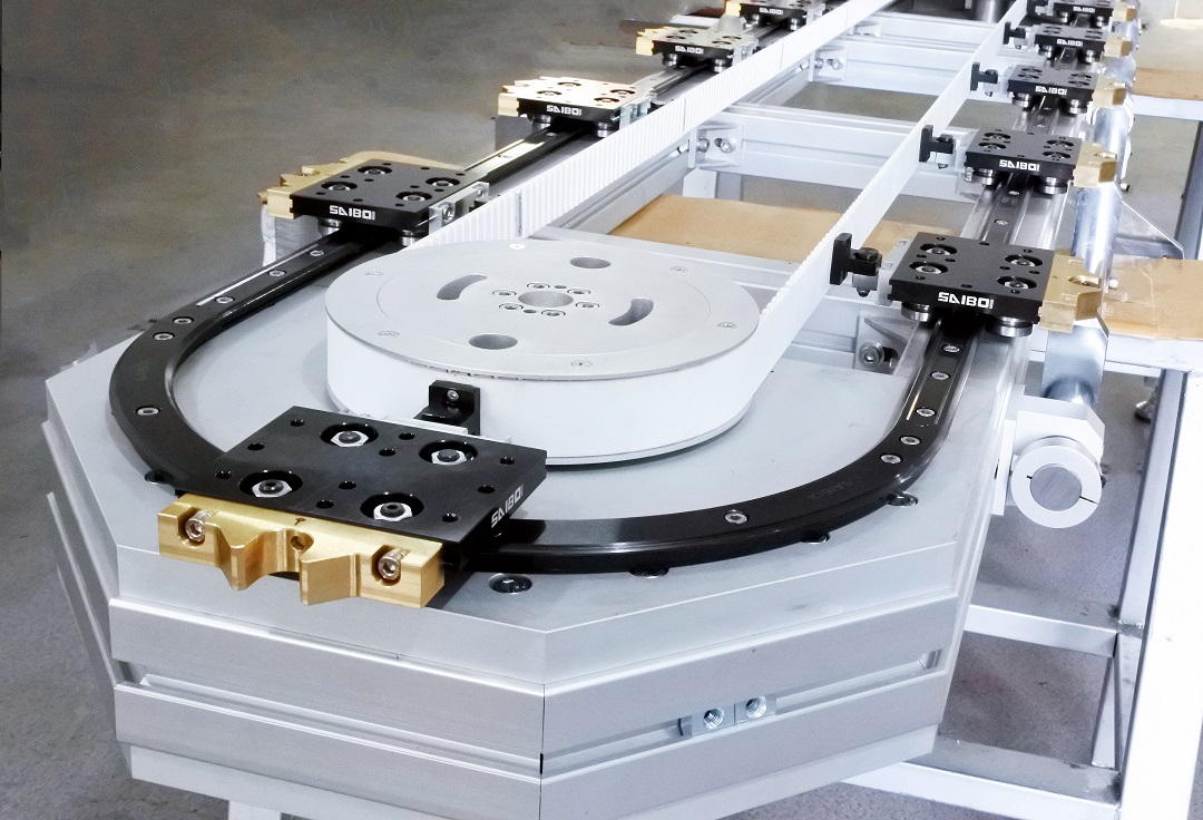 此SAIBO環(huán)形導(dǎo)軌輸送線由皮帶驅(qū)動,具有14個滑塊,8處精密定位。